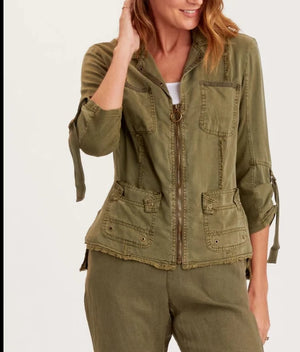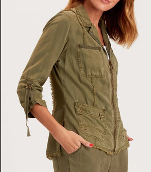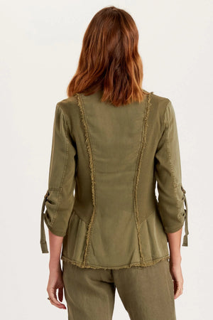 Hardware and raw edges are highlighted in our Raphael Blazer. Fabric mixed contrasting panels, eyelets along the lapel and pocket edges, plus brass D-Ring and tabbed sleeves are just a few of the details thorughout this interesting jacket. Soft Twill:...